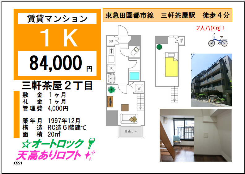 天井高2.1Mロフト 2人入居可 宅配ボックス 【賃 料】 84,000円 【管理費】 4,000円 【所在地】世田谷区三軒茶屋2丁目 【交 通】三軒茶屋駅 徒歩4分 【敷 金】1ヶ月 【礼 金】1ヶ月 【面 ...