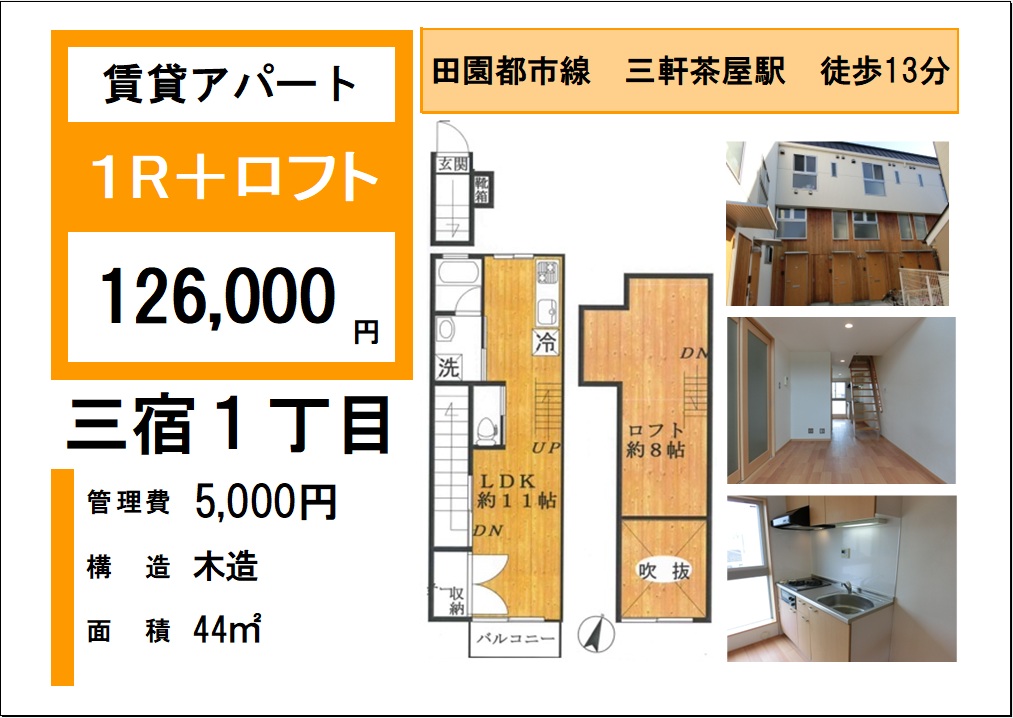 1R+大型ロフトの広々44㎡ オートロック ネット無料 【賃 料】 126,000円 【管理費】 5,000円 【所在地】世田谷区三宿丁目 【交 通】三軒茶屋駅 徒歩13分 【敷 金】1ヶ月 【礼 金】1ヶ月 【面 ...