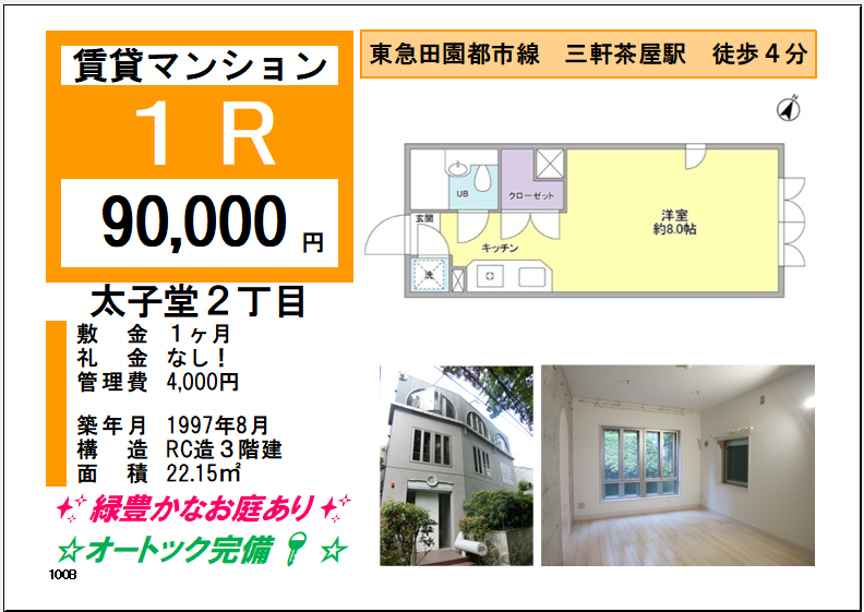 礼金0円 駅近🚃4分 オートロック完備 【賃 料】 90,000円 【管理費】 4,000円 【所在地】世田谷区太子堂2丁目 【交 通】三軒茶屋駅 徒歩4分 【敷 金】1ヶ月 【礼 金】なし! 【面 積】22...