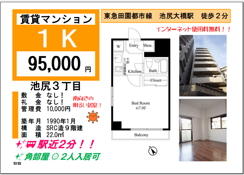 敷金礼金0円 駅近🚃2分角部屋 2人入居可能 【賃 料】 95,000円 【管理費】 10,000円 【所在地】世田谷区池尻3丁目 【交 通】三軒茶屋駅 徒歩2分 【敷 金】なし! 【礼 金】なし! 【面 積】...