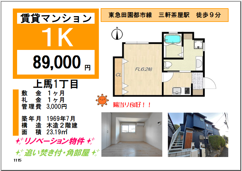 バス追焚き&温水洗浄便座つき! フルリノベ×2階の明るいお部屋! 駅徒歩10分以内! 【賃 料】 89,000円 【管理費】 3,000円 【所在地】世田谷区上馬1丁目 【交 通】三軒茶屋駅 徒歩9分 【敷 金】1ヶ...
