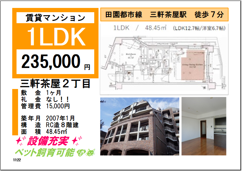 ペット飼育可能◎ ミストサウナ付き◎ 24時間ゴミ出し可能◎ 【賃 料】 235,000円 【管理費】 15,000円 【所在地】世田谷区三軒茶屋2丁目 【交 通】三軒茶屋駅 徒歩9分 【敷 金】1ヶ月 【礼 金...