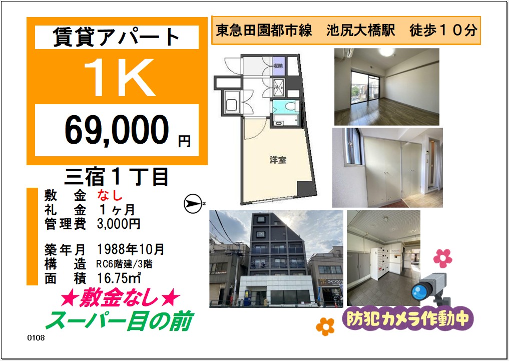 洋室約6帖のお部屋です💁♀️ 敷金なし⚠️ スーパー・ドラッグストア・コンビニ・郵便局が近所で生活便利です✨✨ 【賃 料】 69,000円 【管理費】 3,000円 【所在地】世田谷区三宿...