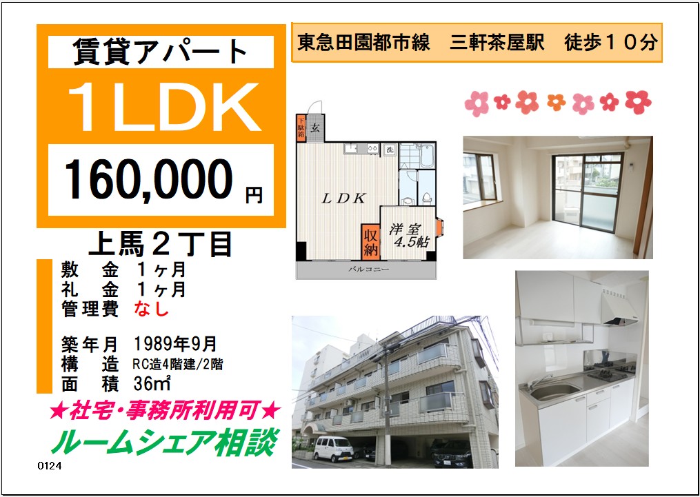 社宅利用可・事務所利用可・SOHO使用可のお部屋になります🍃 【賃 料】160,000円 【管理費】なし 【所在地】世田谷区上馬2丁目 【交 通】三軒茶屋駅 徒歩10分 【敷 金】1ヶ月 【礼 金】1ヶ月...