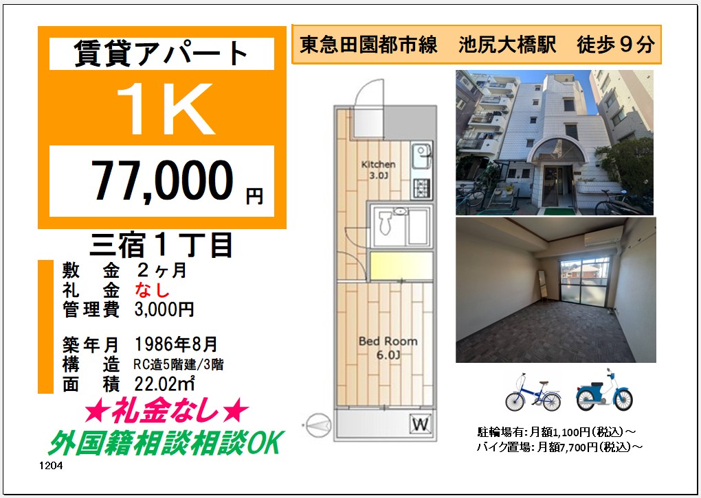 池尻大橋駅徒歩9分のお部屋になります🫡 2駅利用可😉三軒茶屋駅からも徒歩11分✨ 外国籍相談可‼️‼️ 【賃 料】 77,000円 【管理費】 3,000円 【所在地】世田谷区三宿1丁目 【交 通】池尻大橋...