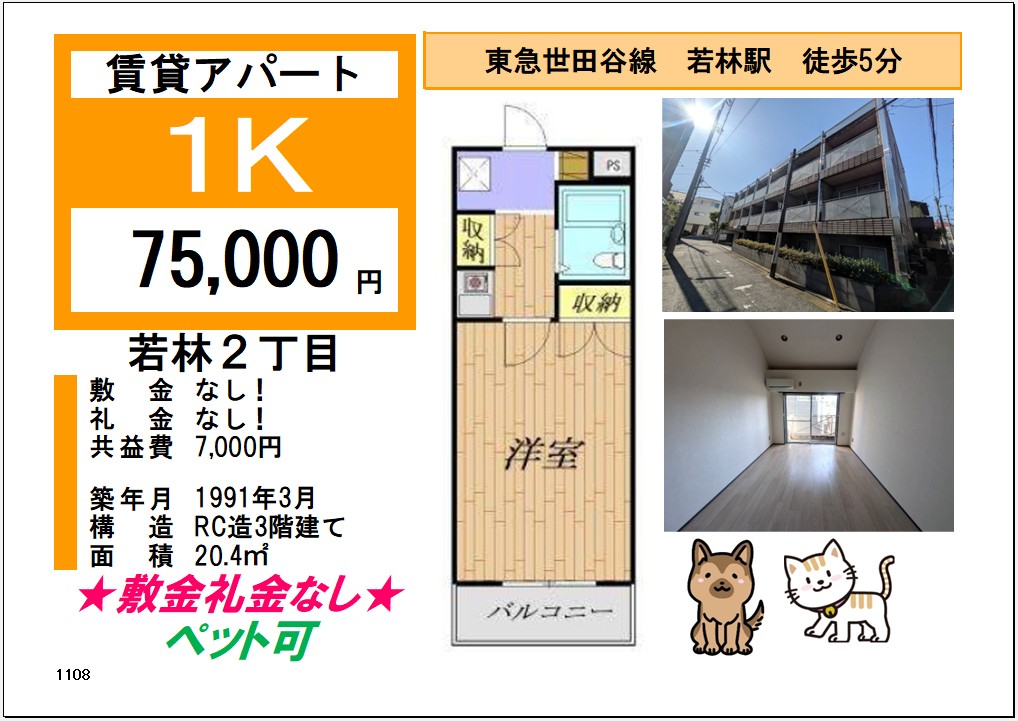 敷金・礼金なし✨ ペット可のお部屋✨ 東急世田谷線『若林』駅から徒歩5分✨ 【賃 料】 75,000円 【共益費・ライフサポート費】 7,000円 【所在地】世田谷区若林2丁目 【交 通】若...