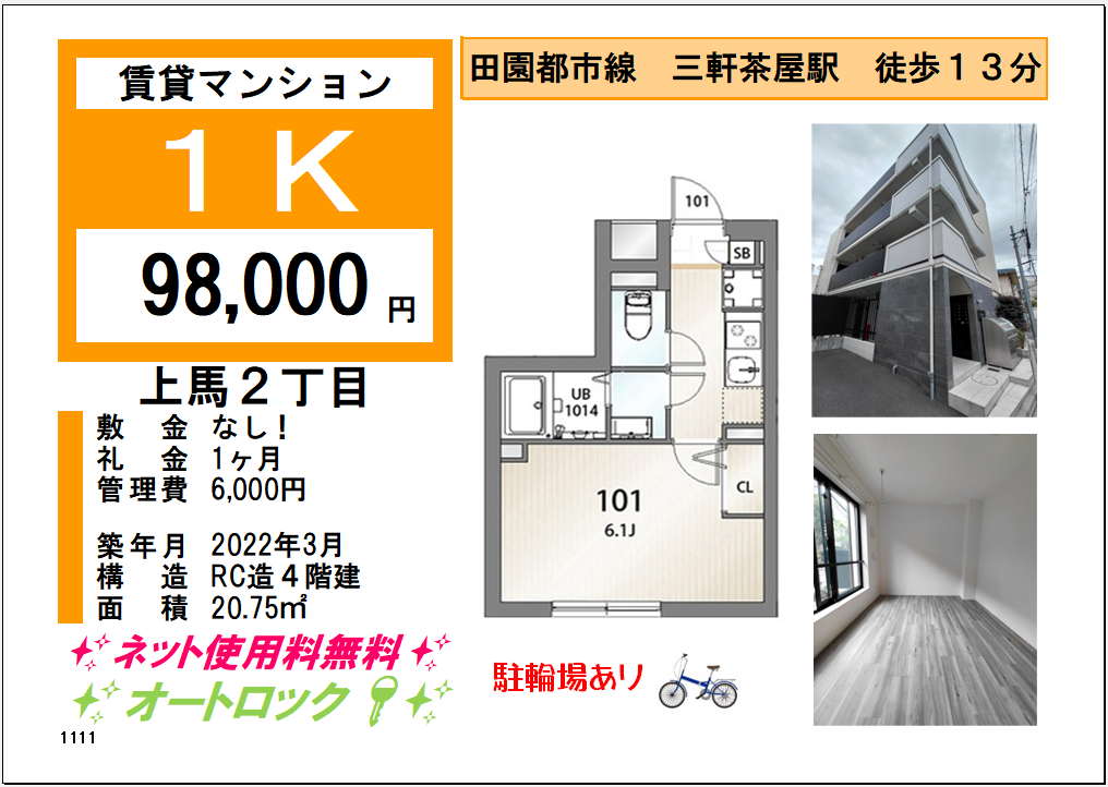 築浅マンション✨ ネット使用料無料💻✨ 駐輪場あり✨ 【賃 料】 98,000円 【管理費】 6,000円 【所在地】世田谷区上馬2丁目 【交 通】三軒茶屋駅 徒歩13分 【敷 金】なし! 【礼 金】1ヶ月 【面...